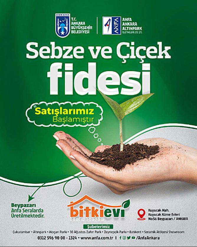BEYPAZARI Ankara Büyükşehir belediyesi, Anfa Genel Müdürlüğü, Beypazarı İlçesinde hayata geçirdikleri seralarda üretilen ve yetiştirilen “Sebze ve Çiçek Fidelerinin” satışlarına başlandığını bildirdi. Yapılan açıklama ile Ankara Büyükşehir belediyesi ANFA genel Müdürlüğünün Beypazarı İlçesinde kurduğu Seralarda üretilen fidelerin satışına başlandığı kaydedildi. Bu anlamda seralarda yetiştirilen ve üretilen fidelerden almak isteyen Başkentliler ve İlçelerde yaşayan vatandaşlar; BİTKİEVİ Sayesinde Çukurambar, Altınpark, Mogan Parkı, 30 Ağustos Zafer Park, Zeynepçik parkı, Batıkent, Seramik Atölyesi Şhowroom ve 0312 590 90 00 dan 1324, www.anfa.com.tr adresleri üzerinde ulaşarak Fide alabilecekler.