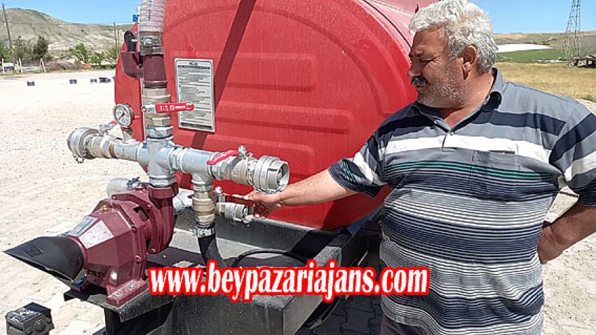 BEYPAZARI (YT)-Ankara Büyükşehir belediye başkanlığı, Beypazarı’nın köylerine, olası bir yangın durumlarında kullanılmak üzere, yangın söndürme amaçlı 3 tonluk su tankı hediye etti. İlk su tankı Beypazarı’nın Kayabükü mahallesine getirilerek mahalle muhtarlığına teslime edildi. Mahalle muhtarı Muammer Köksal, kendilerine yangında öncü olarak kullanılabilecek 3 tonluk su takı hediye eden Ankara Büyükşehir belediye başkanlığına teşekkür etti. Mahalle sakini, İbrahim Köksal’da, mahallelerine teslim edilen ve Traktör kuyruk miline bağlı olarak çalışan, ayrıca yangın vanalarına da bağlanan bilme olanağı bulunan Su takını, yangınlarda İtfaiye ekiplerinin yangın mahalline gelene kadar kullanılabileceklerini söyledi. Mahalle sakini eski köy bekçisi İbrahim Köksal, şunları kaydetti: “Tanker tamamen traktör kuyruk miline bağlanarak çalışıyor. Su tankı işe yarar. Yangında öncü olarak kullanılabilir ve olası yangınlarda, itfaiye ekipleri gelene kadar su tankını kullanabiliriz. Su çekme özelliği, şebekeye bağlanma özelliği ve basıncıyla önemli bir görevi yapacak.”