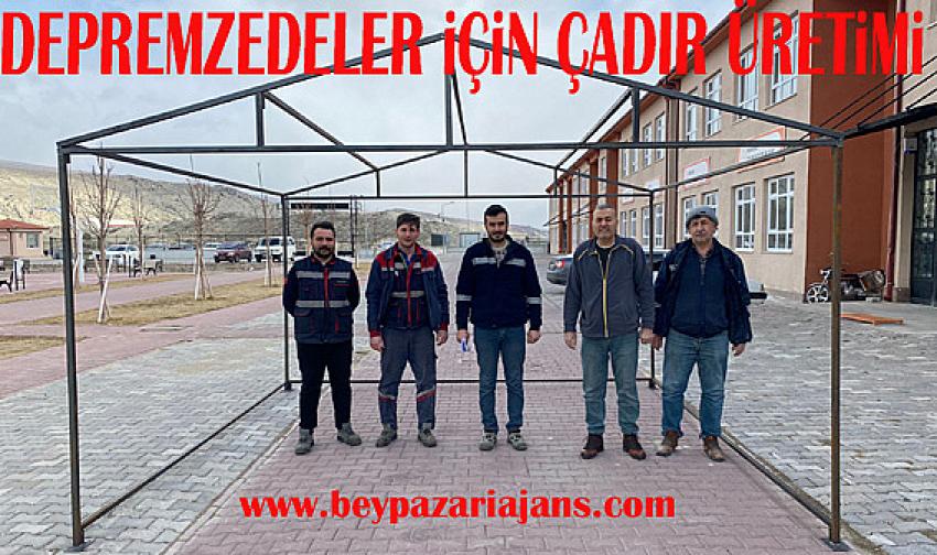 BEYPAZARI (YT)- Yaptığı üretim ve başarısıyla bu yılda Türkiye 1.si olan Beypazarı Fatih Mesleki Anadolu Lisesi, depremzedelerin yanında olmayı sürdürüyor. Beypazarı Fatih Mesleki ve Teknik Anadolu Lisesi, depremzedeler için yaptığı çadır sobası imalatının ardından şimdide, çadır üretiminde bulunduklarını bildirdi. Okul müdürü Nuri Caner, bu konuda yaptığı açıklamasında, yaşanan deprem felaketinin ardından okul olarak Soba ve şimdide çadır üretiminde bulunduklarını söyledi. Çelik profilden Çadır’ın iskeletinin oluşturularak, imalata başladıklarını belirten okul müdürü Caner, “ çadırlarımız 4x4 ebadında oluyor. Çalışmalarımız hızla sürüyor. Şimdilik ilk etap olarak 100 çadır imalatında bulunacağız. Talep olur ise bunu sürdüreceğiz.” dedi.