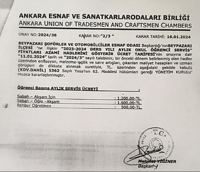 BEYPAZARI (YT)-- Beypazarı İlçesinde öğrenci servislerine, Ankara Esnaf ve Sanatkarlar Odalar birliği başkanlığının onayı ile öğrenci taşıma ücretlerine 20 zam yapıldı. Beypazarı Şoförler ve Otomobilciler Esnaf Odası başkanı Mehmet Doğan’ın bildirimine göre, 2023-2024 Ders yılı Aylık Okul öğrenci servis fiyatlarına Yüzde 20 Zam yapılarak uygulandığını söyledi. 2024/3 sayılı talebinin, bir öncesi dönem belirlenmiş olan hadler üzerinde enflasyon, malzeme-işçilik ve saire artışları, çıkarılan maliyet hesapları ve uzman görüşleri de dikkate alınmak suretiyle, TL üzerinden aşağıdaki şekilde kabulü(KDV. Dahil) 5362 sayılı Yasanın 62. Maddesi hükümleri gereği yönetim kurulunca kararlaştırılmasının akabinde yüzde 20’lik zamla birlikte Fiyat tarifesinin aşağıda olduğu gibi belirlendi. Öğrenci Aylık seriş ücreti şöyle belirlendi: Öğrenci başına Sabah- Akşam için 1.200.00 TL; Sabah-Öğle-Akşam 1.600.00 TL, Rehber Öğretmen için 500,00, TL olarak belirlenerek zam uygulandı.