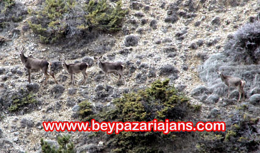 BEYPAZARI (YT)- Beypazarı ilçesinde bulunan köyler ve ormanlık alanlar doğal yaşam canlılarına ev sahipliği yapıyor. İlçeye bağlı Sekli, Hırkatepe, Dudaş, Yıldız, Aşağıgüney, Yukarıgüney, Nuhhoca, Köst, Kozağaç, Kaplan ve Doğanyurt köyleri çevresinde yaşayan geyiklerin, havaların ısınmasıyla yerleşim yerlerine geldiği görüldü. Karabire, Doğanyurt Mahallesi sakini İzzet Koçak(80), yaralı bulduğu geyik yavrusunu 3 ay inek sütüyle evinde besledikten sonra Doğa Koruma ve Milli Parklar görevlilerine teslim ettiğini söyledi. Köyün başlarında yada araziye çıktıklarında ve gezerken birçok geyikle karşılaştıklarını aktaran Koçak, bölgenin adeta bir hayvanat bahçesini andırdığını kaydetti. Boğaların sesini duyuyoruz: Sabahları kalktıklarında yaban hayatı canlısı hayvanların sesini duyduklarını ifade eden Koçak, "Bu seslere öyle alışmışız ki ses çıkarmadıkları zaman bir eksiklik olduğunu düşünüyorum." dedi.