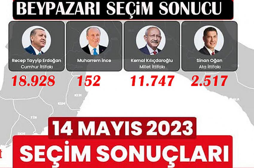 BEYPAZARI (YT)-14 Mayıs İtibariyle yapılan Cumhurbaşkanlığı ve 28. Dönem Milletvekili genel seçimlerinde, Cumhurbaşkanı adaylarının aldıkları oylar şöyle: Recep Tayyip Erdoğan: 18 bin 928 Kemal Kılıçdaroğlu : 11 bin 747 Sinan Oğan : 2 bin 517 Muharrem İnce : 152 olarak belirlendi: 28. Dönem Milletvekili Genel seçimleri dolayısıyla Partilere göre Oy dağılımı söyle: Adalet ve Kalkınma Partisi: 11 bin 752 Milliyetçi hareket Partisi : 5003 İYİ Parti :9 bin 604 Cumhuriyet Halk partisi : 3 bin 601 Yeniden Refah partisi : 793