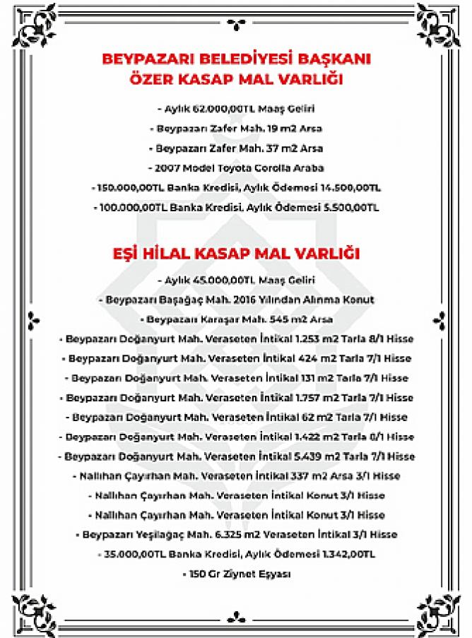 | -Beypazarı belediye başkanı seçilen Dr. Özer Kasap, mal varlığının yer aldığı listeyi belediye giriş kapısına astığını bildirdi. | ||