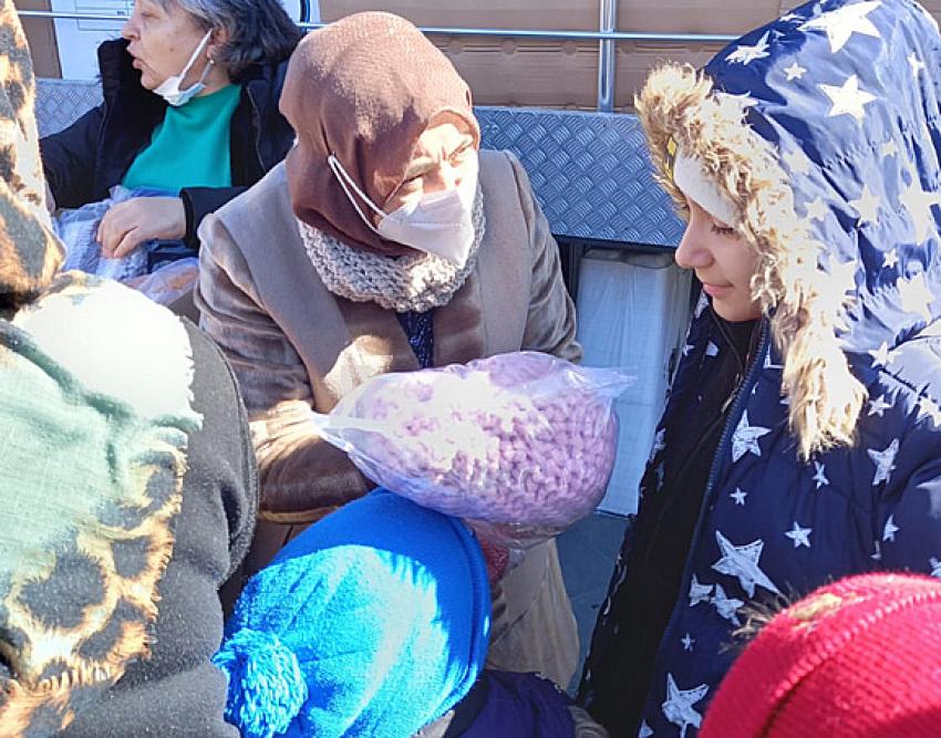BEYPAZARI (YT)-Beypazarı İlçesinde kadınların ördükleri atkı, bere, çorap, eldiven, patik ve çocuk giysileri deprem bölgesinde çadır çadır gezilerek çocuklara dağıtıldı. AK Parti Kadın Kolları başkanı Sabriye Yılmaz, Beypazarı ilçesinde Deprem bölgesi için seferber olan yüce gönüllü kadınların ördüğü el işlerinden oluşan giysileri, bereleri deprem bölgesine, Belediye başkanının Eşi Ayşe Kaplan ile gelerek dağıttıklarını söyledi. 2 bin 500 ün üzerinde el örmesi, giysilerden oluşan geneli çocuklar için örülmüş ürünleri Deprem bölgesinde çadır çadır, gezerek depremzede çocuklara dağıttıklarını belirten Kadın Kolları başknaı Sabriye Yılmaz . Bir nebze olsun onların gönüllerini almaya çalıştık. Çocuklar için örülen Atkı, bere, Eldiven, Patik, Şapka ve yeleklerden oluşan çocuk giysilerini Kahramanmaraş, Gaziantep-Nurdağı ve İslâhiye bölgelerinde bizzat yerinde çocukların ellerine teslim ettik” dedi. Ak Parti Kadın Kollaları başkanı Sabriye Yılmaz, Kahramanmaraş ziyaretimizde, Beypazarı belediyenin 2 adet Mobil Mutfak tır’ınıda ziyaret ettiklerini ve çalışanlara kolaylıklar dilediklerini aktardı. Deprem bölgesinden Dönem Belediye başkanının Eşi Ayşe hanım ve AK Parti Kadın kolları başkanı Sabriye Yılmaz'a teşekkürlerini sunan Belediye başkanı Tuncer Kaplan, “Allah çocukları düşünen gönlü yüce Beypazarı’lı kadınlarımızı, başımızdan eksik etmesin. Eşim Ayşe Hanım ve AK Parti Kadın Kolları başkanı Sabriye Yılmaz başkanıma çok çok teşekkür ediyorum. Gezileriyle ilgili olarak, son durum hakkında bizi bilgilendirdiler. Kendilerine çok teşekkür ediyorum” dedi.