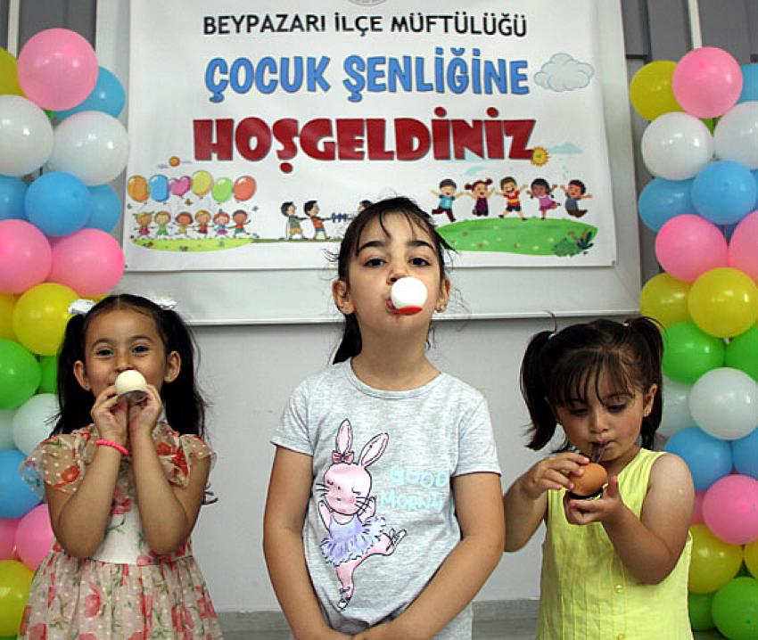 BEYPAZARI (YT)- Beypazarı Müftülüğü ilçe genelinde 4-6 Yaş arası çocuklar için şenlik düzenledi. Evliya Çelebi Mesleki ve Teknik Anadolu Lisesi salonunda düzenlenen etkinliğe İlçe Müftüsü Ahmet İnciler, Din görevlileri, çocuklarla birlikte aileler katıldı. İlçe Müftüsü İnciler yaptığı konuşmasında, Müftülük olarak çocuklara temel dini eğitimler vermeye çalışırken onları eğlenceden de mahrum bırakmadıklarını ama en büyük görevin burada aileye ve annenlere düştüğünü söyledi. Kuran kursu öğretmenleri eşliğinde, çocuklar çeşitli oyunlar oynarken, Halat çekme, yumurta yarışı ve bazı animasyon görüntüleri eşliğinde oymana fırsatı buldu. Çocuklar, çocuk olmanın sevinciyle özgürce oyunları oynadı. Çocukların neşeleri sevinçleri yüzlerinde okunuyordu.