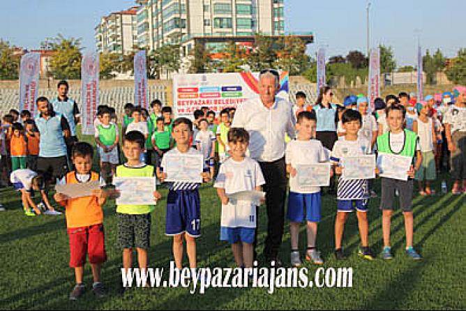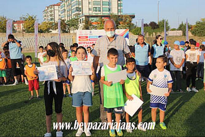 BEYPAZARI (YT)-Beypazarı İlçesinde 2021 Yaz Dönemi 05 Temmuz ile 28 Ağustos tarihleri arası Beypazarı gençlik ve Spor İlçe Müdürlüğü ve Beypazarı belediyesi işbirliği ile düzenlenen Gençlik ve Spor Bakanlığı Spor Okulları katılım sonrasında sertifikalar verildi. İlçe genelinde açılan Yaz Spor Okulu kampanyası çerçevesinde Futbol, Atletizm, Yüzme, Voleybol, Tekwando ve Okçuluk dallarında açılan kurslara Futbolda(220), Yüzme Bilmeyen kalmasın projesi kapsamında(372), Atletizmi geliştirme projesi kapsamında (125), Tekwando(37), Kort Teniz (23), Voleybolda (18), okçulukta (15) olmak üzere toplamda 800’e yakın çocuk katılırken, bu çocuklara sertifikaları verildi. Şehir Stadında düzenlenen Sertifika törenine Belediye başkanı Tuncer Kaplan, İlçe Milli Eğitim şube müdürü Rahmi Çalışkan, Gençlik Spor İlçe Müdürü Özgür Bediz ve Halk Eğitim Merkezi müdürü İdris Göbütoğlu ile birlikte aileler ve öğrenciler katıldı. İlçe Gençlik ve Spor müdürü Özgür Bediz, bundan sonraki yıllarda hedeflerinin, çok daha fazla çocuğa ulaşarak onları sporla tanıştırmak, spora yönlendirmek ve onlara sporcu kimliği kazandırarak, ülkemiz adına önemli katkılar sunmak olduğunu söyledi.